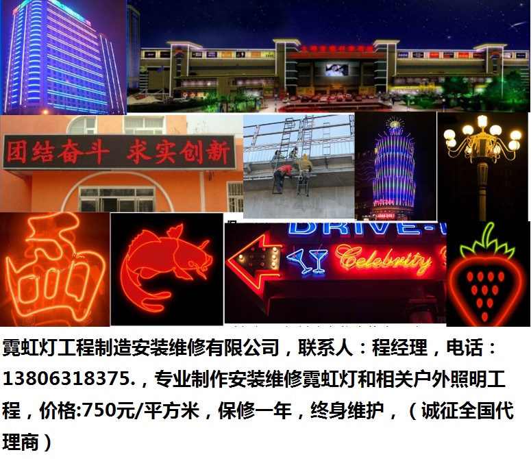 烟台市霓虹灯工程制造安装维修有限公司,联系人:程经理,电话:13806318375.,专业制作安装维修霓虹灯和相关户外照明工程,价格:750元/平方米,保修一年,终身维护,(诚征全国代理商),专业从事商业门面,招牌、街道景观的整体设计。设计制作安装喷绘广告牌,发光字,灯箱,LED灯饰,霓虹灯,电子显示屏,单立柱,路灯,楼体光亮工程等等,烟台市大型霓虹灯工程制造安装维修有限公司,专业制作安装整座工作区的门头,楼顶大字和各栋大楼的亮化制作安装维修。专业从事整条街道的商业门面,招牌、街道景观的主题整体设计施工制作安装维修。是户外视频专业制作安装公司。更多详情,登陆:公司网站: http://blog.sina.com.cn/s/blog_180c23d6a0102xvc7.html。烟台市霓虹灯工程制造安装维修有限公司在威海市区,文登区,荣成市,乳山市及烟台芝罘、福山、牟平、莱山4个区及长岛县,龙口、莱阳、莱州、蓬莱、招远、栖霞、海阳,,青岛,潍坊,淄博,德洲, 东营,济南,天津,北京, 大连, 沈阳, 上海,.苏州, 无锡市,临沂,本溪,衡水,长春,哈尔滨,太原,徐州,合肥,郑州,武汉,杭州,南昌,长沙,泉州,广州,西安,成都,兰州,贵阳,昆明,呼和浩特,重庆,日照,丹东,石家庄,吉林,齐齐哈尔,大同,常州,芜湖,开封,黄石,宁波,赣州,常德,厦门,深圳,咸阳,自贡,天水,六盘水, 曲靖, 包头,桂林,银川,乌鲁木齐,拉萨,泰安, 葫芦岛,唐山,四平, 佳木斯,阳泉,南通, 蚌埠,安阳, 襄樊,温州,九江,郴州,三明, 珠海,商洛,攀枝花, 白银,遵义, 玉溪, 乌海,,石嘴山,克拉玛依市,昌都地区等地制作安装了大量优质的户外照明广告牌,获得客户们的赞誉和褒奖。我公司注重将崭新的照明科技产品运用到工程当中,设计突出客户行业特点,起到很好的宣传效果,突出了客户正面形象,为客户们带来良好的广告效果和经济效益。霓虹灯是户外广告的主要形式之一,为企业和单位主体建筑在夜幕中增加色彩和动感,展现公司企业积极向上开拓进取的精神风貌,时代感强烈。同时为所在街道的夜晚增加靓丽的风景,特别是重大节庆日的夜晚,更能体现会说话,有感情的建筑。装饰霓虹灯时,设计安装的画面体现公司,单位性质可以很好的提升企业形象,为客户留下深刻的印象,为扩大业务打下良好的基础。, 霓虹灯一般分两大类: 1、静态灯,颜色固定,各部分不变化;