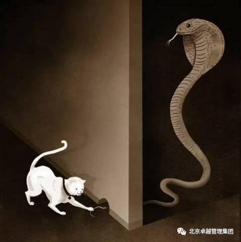 画中的猫把蛇尾当成鼠尾,毫不畏惧地用爪子抓着蛇的尾巴。