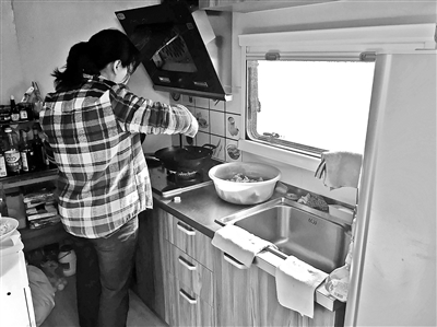 北青报记者看到,房车的“墙”,用铁皮制作而成,中间没有任何填充物,是空心的。到了中午,清莲打开灶台燃气做饭,蓝色的明火烧烤着锅底,也将一股股热气传送至30平方米的每一个角落。“我们这屋子就是这样,热得快,冷却得也快”。