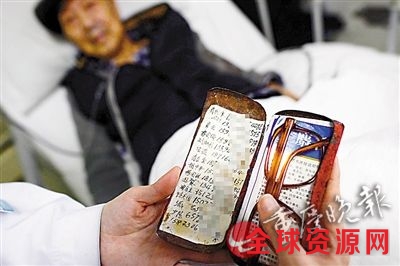 他随身带一个锈迹斑斑的红色铁皮眼镜盒,盒子里贴着一张小纸片,写了十几个人名和电话,都是侄儿、侄媳妇这些亲戚,还有田医生。