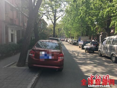 4月13日,北京一街道车辆停上人行道。汤琪 摄