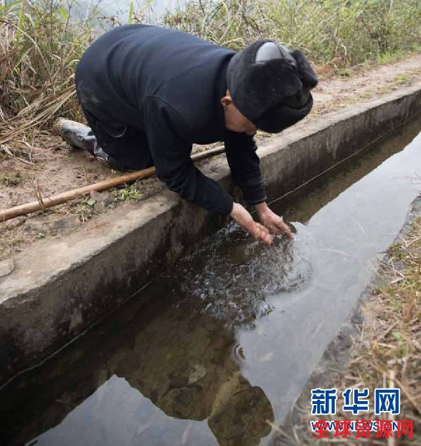 黄大发捧起一捧水渠里的水洗手(3月24日摄)。新华社记者 刘续 摄
