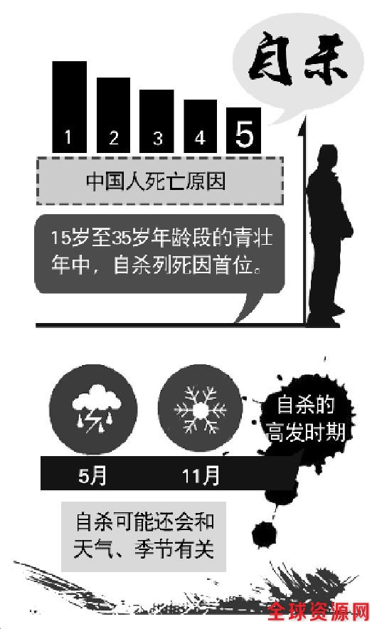 国家卫生部曾公布一项调查数据,数据显示,自杀在中国人死亡原因中居第5位,15岁至35岁年龄段的青壮年中,自杀列死因首位。在全球,自杀是导致15至19岁青少年死亡的五大原因之一。