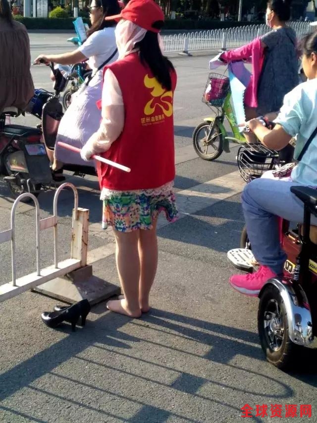 活动中,德圣志愿者由于穿着高跟鞋,将鞋子脱掉,也坚持在文明交通活动中。