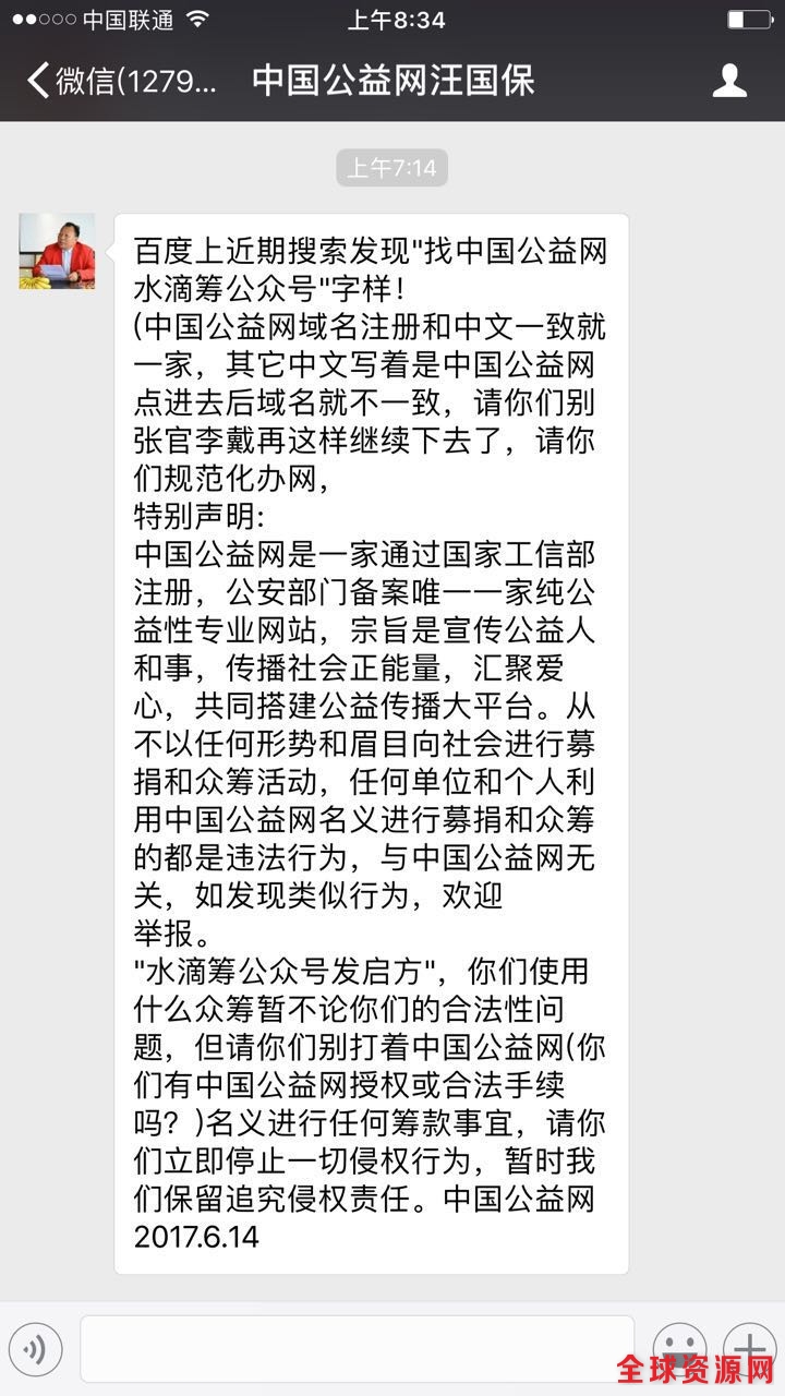 "水滴筹公众号发启方",你们使用什么众筹暂不论你们的合法性问题,但请你们别打着中国公益网(你们有中国公益网授权或合法手续吗?)名义进行任何筹款事宜,请你们立即停止一切侵权行为,暂时我们保留追究侵权责任。中国公益网2017.6.14