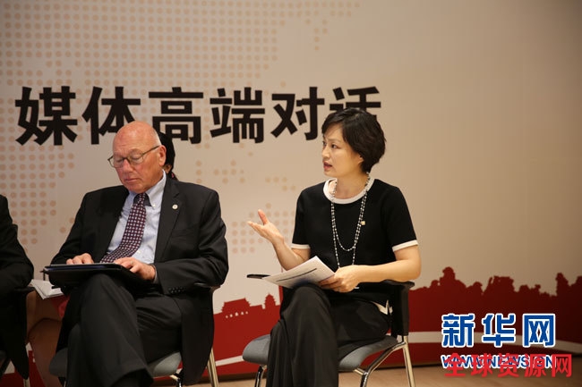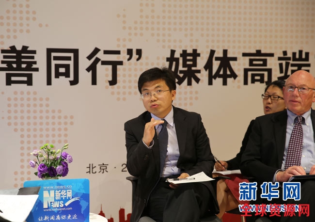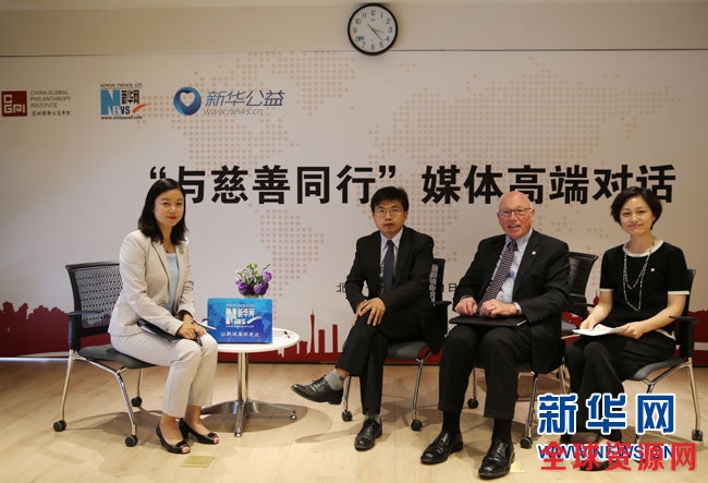图为访谈活动现场,新华公益邀请到美国印第安纳大学礼来家族慈善学院院长Tempel教授(右二)、国际公益学院助理院长兼教务长曾晶(右一)、中国扶贫基金会副秘书长陈洪涛(右三)参与讨论。