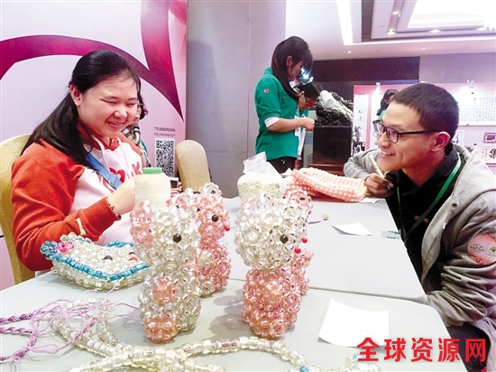 曾经得到王颂汤帮助的盲人女孩何采萦在义卖现场制作串珠。