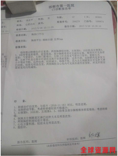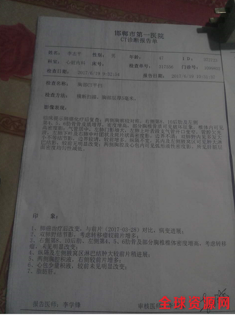 救助患者:李志平,系河北省邯郸市肥乡区天台山镇西马固村村民,因去年四月中旬得病在邯郸市第一医院东区住院,已确诊肺癌晚期系恶性肿瘤,刚入院时生命垂危,医院已下达病危通知书了,当我听到这不幸的消息时当时就懵了,心想他不过就是个咳嗽不至于这么严重,我不相信,可病理采取结果出来,已确诊肺癌晚期,我真的傻了,他是我家的顶梁柱,他要不能工作,无疑是等于天塌了,看到他在病床上昏迷不醒,我的心都碎了,上有七十岁的老母亲,下有一双儿女,幸福的生活就这样破灭了,儿子未成家,女儿还小,婆婆岁数大,他一生病,我还要照顾他,无疑是雪上加霜,没有经济来源,他身体的各个脏器都衰竭了,完全依靠药物治疗来维持生命。