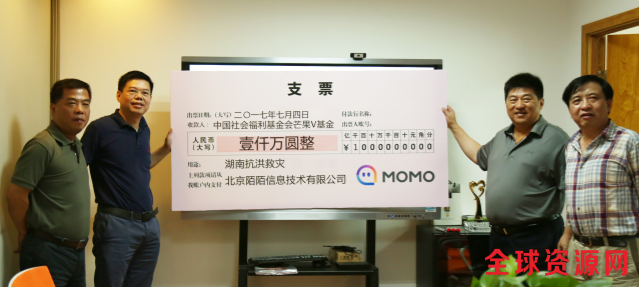当得知家乡受灾后,陌陌公司董事长唐岩第一时间联系到了芒果V基金,希望能为家乡灾后重建出一份力。7月5日上午,陌陌公司副总裁贺宏震代表公司递交了1000万元的捐赠支票并转达了公司对灾情的关注及对受灾居民的亲切慰问。湖南广播电视台党委委员、副台长穆勇代表湖南受灾群众对这一善举表示感谢,并表示将妥善用好善款,做好灾后重建工作。