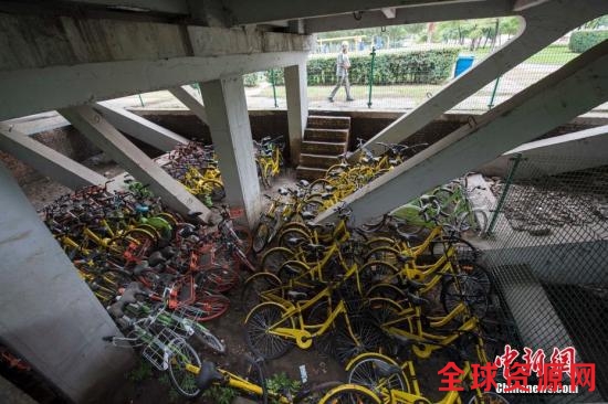 资料图:7月25日,山西太原汾河公园,近百辆共享单车被锁放在步行桥下,等待共享单车公司统一运送走。 中新社记者 武俊杰 摄