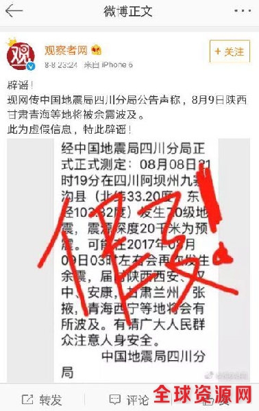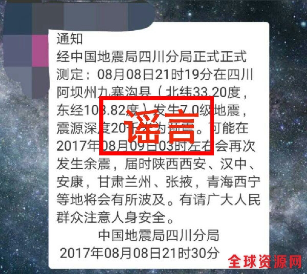 另外,有消息以中国地震局四川分局名义称9日3时将发生余震。此消息为谣言。