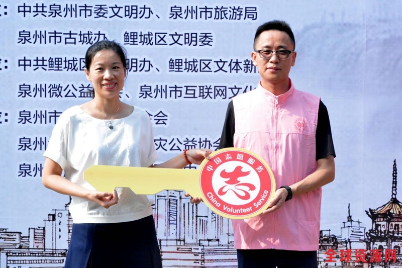 泉州市委文明办副主任吕宝贝(左一)为泉州微公益协会颁发省级志愿服务示范驿站(泉州肃清门)钥匙。