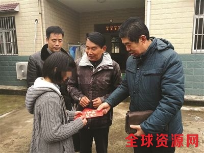 今年春节,老朱(右一)给困难学生捐款