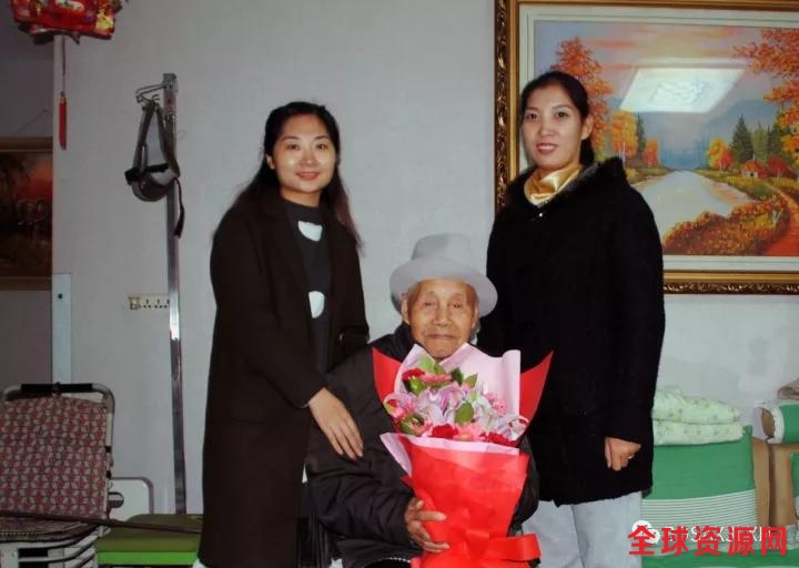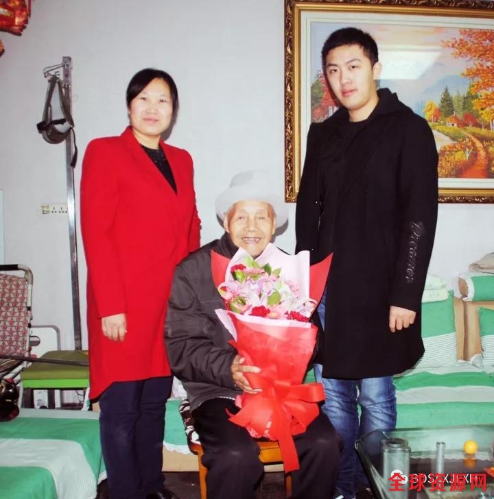河北建新集团王秀英主任、河北软件职业技术学院大学生李铭铠和百岁老寿星在一起