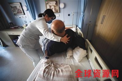 10月23日,北大首钢医院安宁疗护中心,护士将一名患者从床上扶起。
