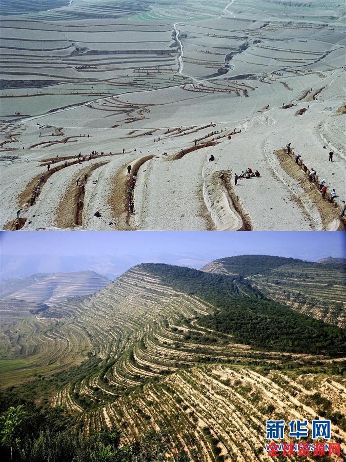 拼版照片:上图为1983年,彭阳县对光秃秃的荒山进行治理(林生库摄);下图为2016年8月20日拍摄的彭阳县丘陵山区的面貌(孙有亮摄)。