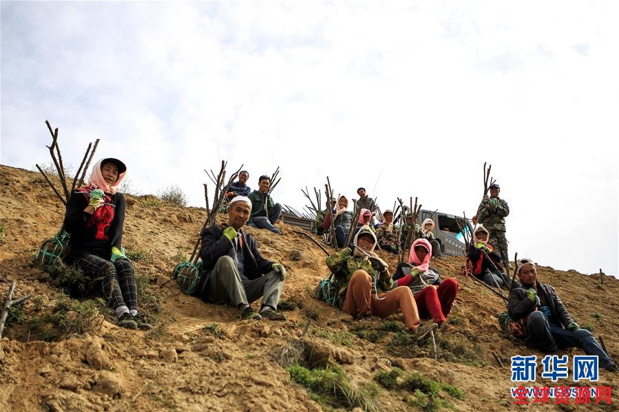 10月31日,在彭阳县王洼镇孙阳村的一处丘陵山地,背着树苗的造林队成员坐在山坡上休息。