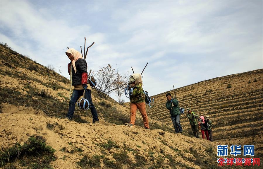 10月31日,在彭阳县王洼镇孙阳村的一处丘陵山地,造林队的成员将树苗背到丘陵上。