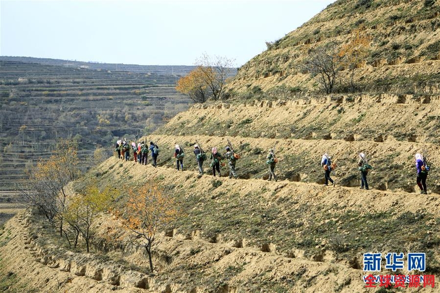 10月31日,在彭阳县王洼镇孙阳村的一处丘陵山地,造林队的成员背着树苗爬山。