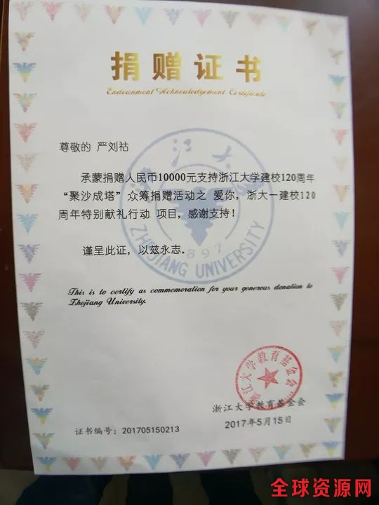 今年5月,浙江大学建校120周年,严刘祜为母校捐赠一万元,此为捐赠证书。王晨辉摄