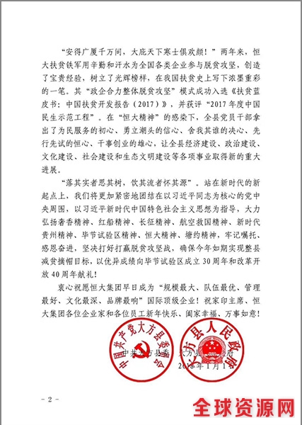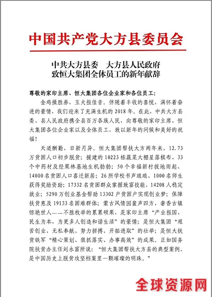 2018年元旦,中共大方县委、大方县人民政府向恒大集团全体员工发来了新年献辞。据了解, 从2015年年底开始,恒大集团结对帮扶毕节市大方县,两年来成果斐然。一连串喜人的数字也出现在此次大方县的新年献辞中:“12.73万贫困人口初步脱贫;10223栋蔬菜大棚星落棋布、33个中药材及经果林基地生机勃勃;50个幸福新村拔地而起、14000名贫困人口喜迁新居;26所学校书声琅琅、1000名师生获得奖励资助;17332名贫困群众掌握致富技能,14208人稳定就业;5290万创业基金帮助13302户贫困户实现创业梦;保障扶贫惠及19133名困难群体。”