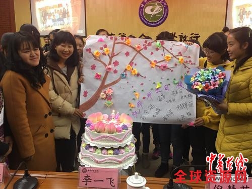 2017年12月27日,在云南中医学院,一群年轻的学生围着他们共同的“爷爷”李一飞,唱生日歌、送生日礼物、切生日蛋糕,共同为爷爷庆祝90岁大寿。