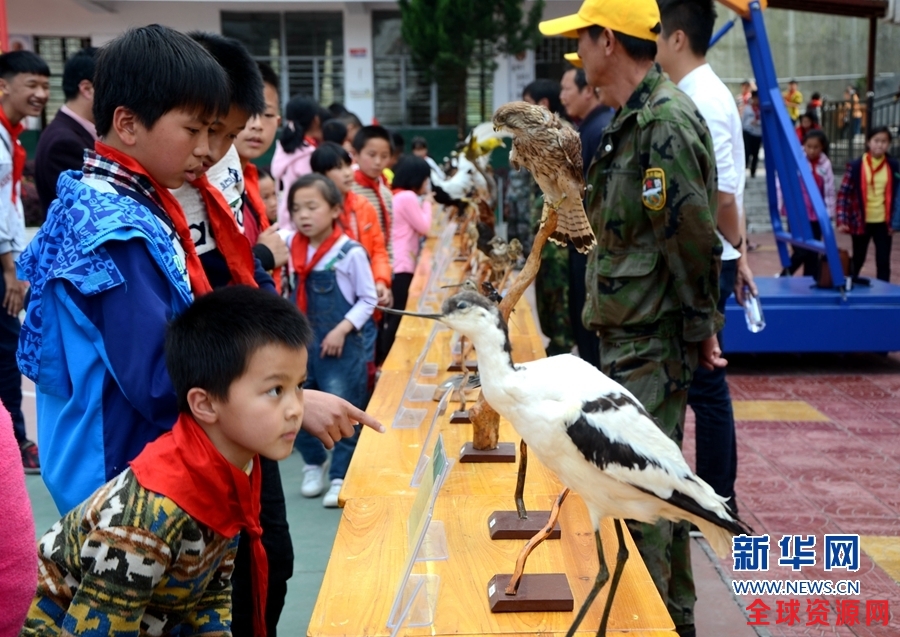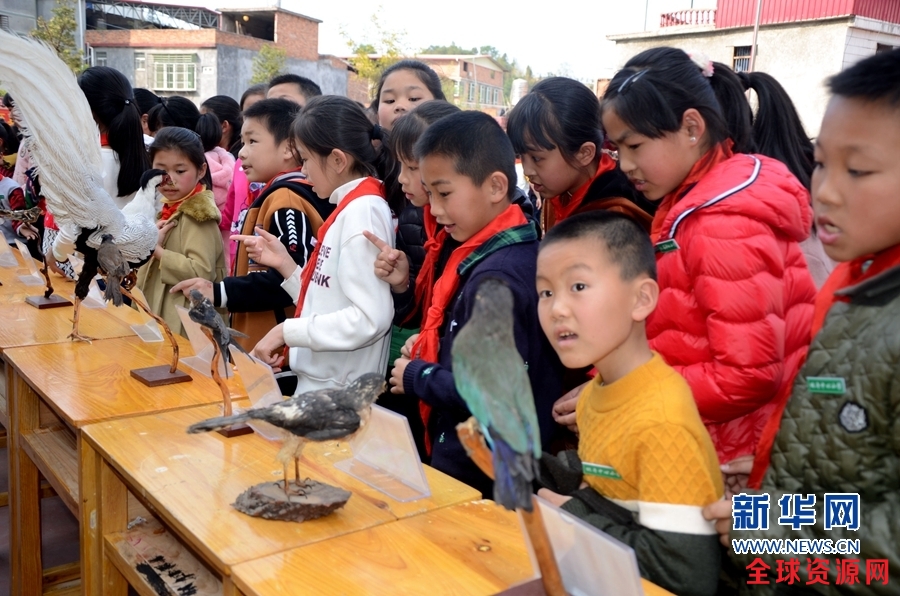 3月28日下午,以“保护鸟类资源 守护绿水青山”为主题的“爱鸟周”宣传活动在泉州市安溪县桃舟中心学校举行。图为小学生正在观看鸟类动物标本。新华网 王雄 摄
