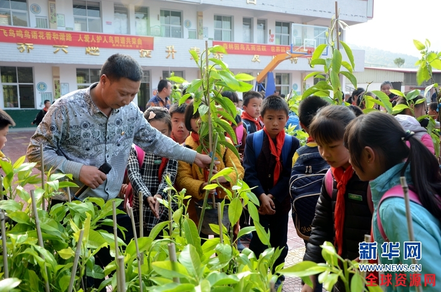 图为学校分发300株小树苗给学生,让他们带回家种,为鸟类提供栖息的场所。新华网 王雄 摄