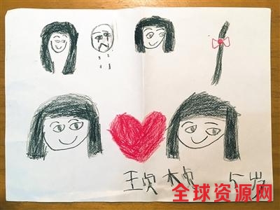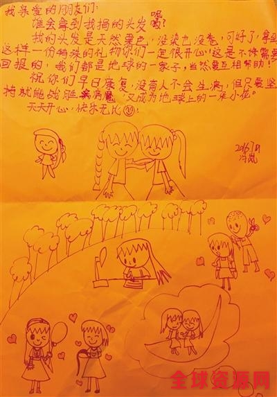5岁的小朋友王贞桢捐了自己头发,并附上一幅充满爱心的图画。