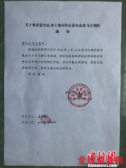图为景洪市森林公安局向主办方下达“要求停止放飞计划”的通知 常宗波 摄