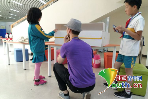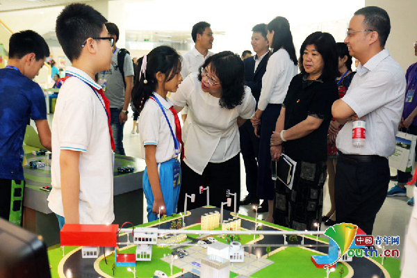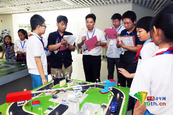 北京市东城区史家小学分校的学生们向嘉宾介绍他们的作品“智慧家园——智能立体交通展示模型”。中国青年网见习记者 叶婉莹 摄