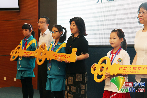 虞苍璧(左二)、张萍(左四)、钱蓉晖(右一)为小朋友们送上“开启科技之门”的金钥匙。中国青年网 见习记者 叶婉莹 摄。
