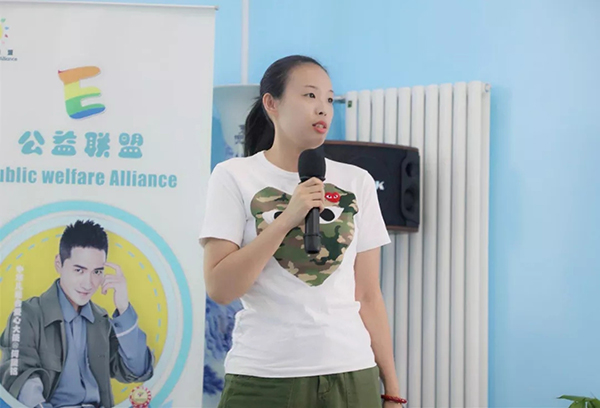 中华儿慈会副秘书长姜莹(左一)为武汉爱特创始人胡弘授旗。