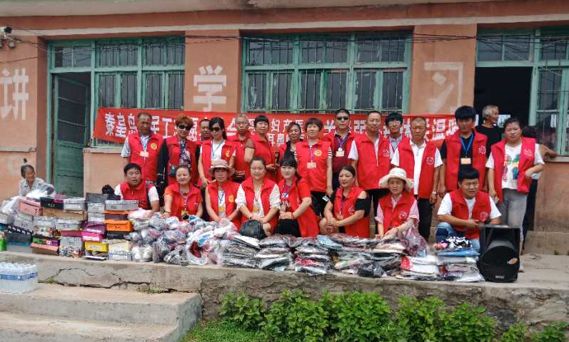 探访活动结束后,志愿者们在会长王军、书记白忠义和瑞杰团队团长陈爱国、大巫岚团队团长孙玉娥、双山子团队团长柴小燕、卢龙团队团长郑华的带领下将二百套崭新的服装和一百双鞋分发给村民。