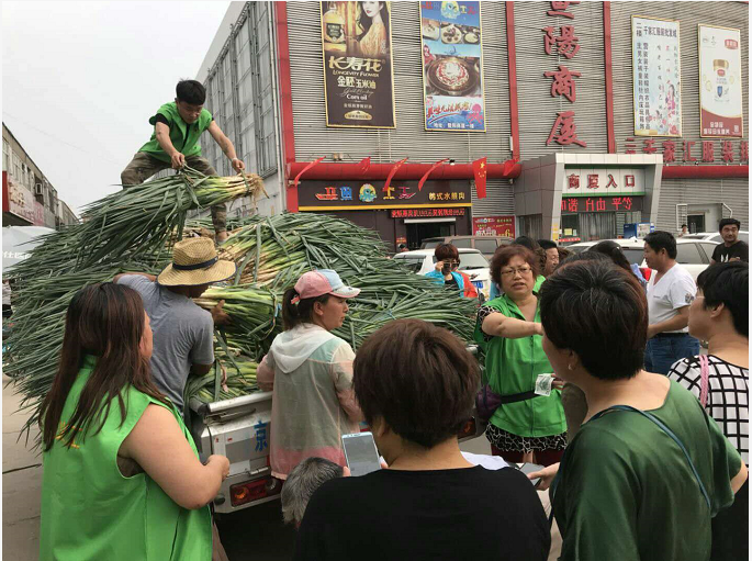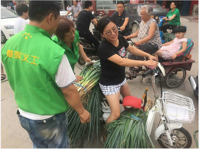 7月12日,饶阳春晖义工协会得知消息后,立刻发动所有义工和爱心人士进行购买并组织销售。义工们和爱心人士主动帮助老人在地里刨葱,打捆,装车,并拉到市场上卖葱。