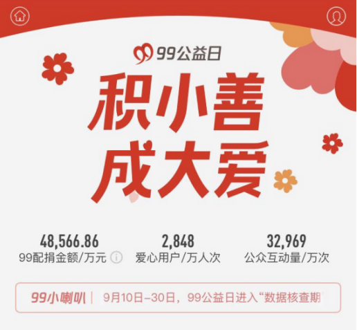同时,为了提供更丰富的趣味公益交互方式,今年99公益日新增家乡公益、爱心加倍卡、集小红花、捐行为公益、明星短视频互动等玩法。在9月7日至9月9日配捐阶段,更有大量用户在社交平台上晒出参与99公益日的截图,让各种暖心话题在刷爆朋友圈的同时,99公益日在新浪微博上的浏览量也高达9.9亿。