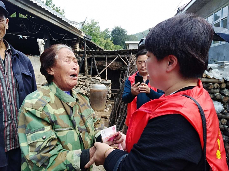 志愿者白桂芬目睹火后惨状深表同情,当场捐赠现金三百元。梁福珍的老伴儿接过物品和现金后,拉着 志愿者们的手,感激之情难以表达。