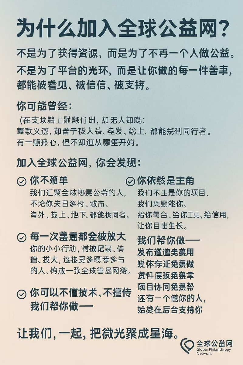 全球公益网定位为一个开放、共创、自运行的全球公益行动网络,目标不是“控制资源”,而是“释放善意”;不是“替代社会”,而是“赋能群体”;不是“自上而下推动”,而是“自下而上涌现”。