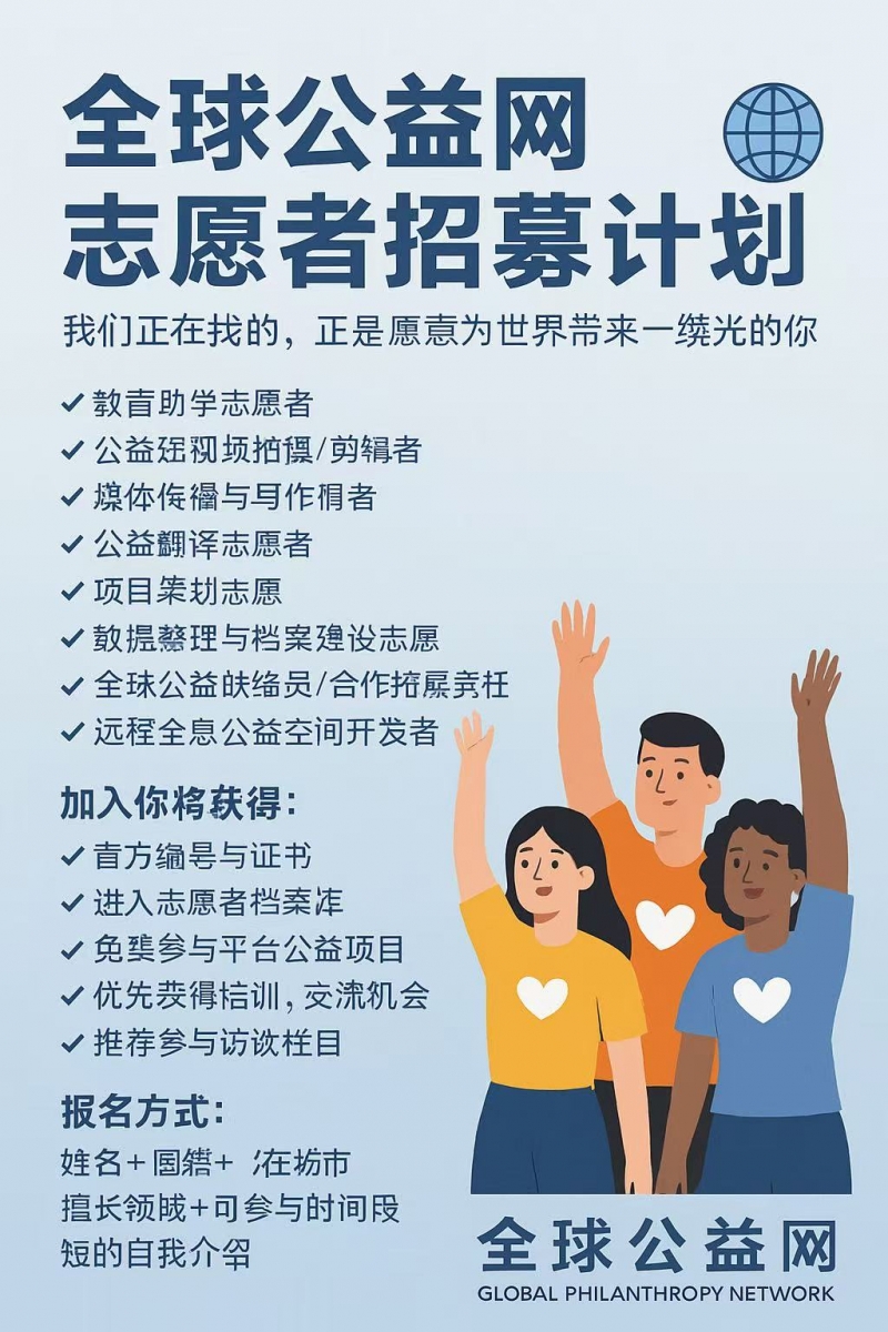 全球公益网(Global Philanthropy Network)由全球资源网国际运营中心发起,致力于构建一个开放、共创、去中心化的全球公益协作平台。为了连接世界各地的爱心个体,我们现面向全球长期招募志愿者,共同参与构建一个“人人可参与、项目可自发、传播可全球化”的公益新生态。