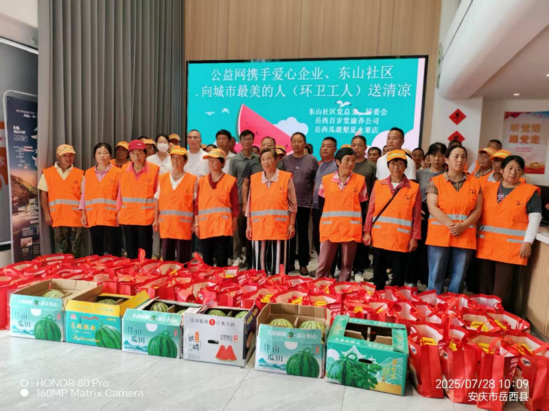人民报道安徽讯(通讯员 王晶晶) 炎炎夏日,热浪滚滚,坚守在街头巷尾的环卫工人始终是城市最靓丽的风景线。7月28日,岳西百岁堂康养调理中心联合东山社区及“瓜甜梨夏”水果店,共同开展“夏日送清凉”公益活动,为辛勤工作的环卫工人送上贴心关怀。